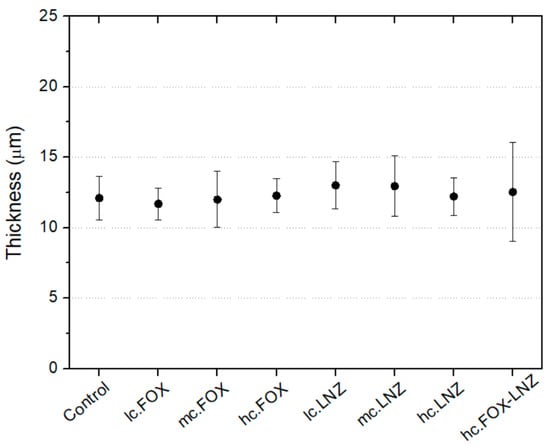 Figure 3 shows the thickness of each coating and the molecular weight of the used antibiotics. Thicknesses ranged between 10 and 20 µm, with a median value of 12.5 µm. Significant differences between the obtained thicknesses were observed.