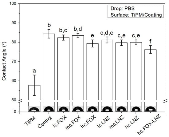Contact angle results for films deposited on TiPM substrates. Bars with different letters denote statistical significance, p < 0.05 one-way ANOVA using Tukey HSD method. N = 10–12. All values are means ± SE.