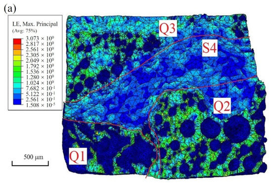 Figure 11 showed the simulation results for the fracture surface and crack growth. As shown in Figure 11a, the fracture morphology was divided into four zones: Q1, Q2, and Q3 were tensile fracture zones, and S4 was a shear fracture zone, similar to the experimental results shown in Figure 8b. Figure 11b showed the simulation results for the crack propagation process under different displacement loading conditions, which revealed that the crack was first initiated and propagated from the defects in regions Q1 and Q2. However, the crack in region Q2 was propagated faster along the direction perpendicular to the loading direction during the continuous tensile process. The reliability of the simulation results was verified as shown in Figure 8c. In summary, the propagation path and the rate of cracks were closely related to the distribution of the internal defects of the solder joints, as discussed in detail in Section 4.1.
