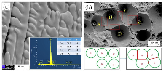 Defects were inevitable for solder joints [11]. As shown in Figure 2, there were many spherical pores in the upper and lower boundaries (the IMC layer and its vicinity) of the reconstructed solder joints, and most of these pores were mutually separated. Generally, it was considered that the main causes of the internal defects of solder joints are as follows: (1) the additive or organic impurities remaining in the Cu bar; (2) the poor wettability of the solder; and (3) the exhaust of the solder and flux during reflow [18,44]. In this study, after the surface of the Cu bars was cleaned by solution for cleaning PCB, a small amount of water and organic material remained on its surface. In addition, the flux was a volatile material [10]. Therefore, during the reflow soldering process, a high temperature caused the flux, remaining water, and organic material to evaporate, and then left the molten solder alloy. However, some gases were not discharged, which resulted in some gases remaining in the solder joints to form spherical pores. Many pores were concentrated near the IMCs. Moreover, there were a few pores that did not completely leave the solder. The shrinkage pores and flakes might form near the solder surface after the solder solidifies, similar to the crack in the Q1 region in Figure 7a [10].