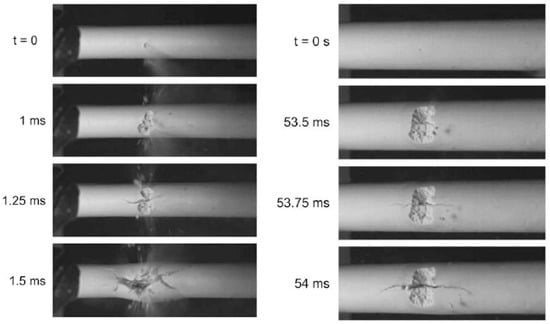 Previous studies have addressed both sides of the failure equation: the applied loading and the material properties. The breakup/debonding model of deposit removal during jet impingement was studied by Pophali et al., who conducted a model experiment using a supersonic jet impacting a ¼ scale model deposit made of gypsum while imaging the breakup at high speed as depicted in Figure 1 [8]. The authors used two deposit configurations, thin and thick, to investigate the fracture pattern induced by jet impingement. The fracture pattern for both deposits followed the same sequence: erosion leads to a pit, which is subsequently pressurized by the jet, causing circumferential tensile force, axial cracks, and finally debonding [9]. The time required for this sequence was much longer for thicker deposits, but the sequence itself was unchanged. Although the fast fracture nature of this process implies that a conventional fracture mechanics failure criterion should be used to predict failure, this has not previously been demonstrated in the literature.