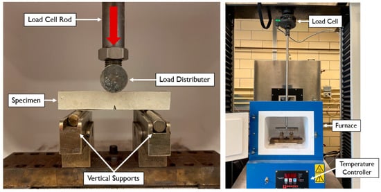 The sintered specimens were tested at room temperature and then various temperatures between 400 °C and 500 °C. Figure 5 shows the experimental three-point bend platform, which sits in the oven during testing. Load was introduced through a long rod which runs through a hole in the top of the oven to the load cell. A cylindrical load distributor was threaded at the end of the load cell rod and spanned the entire width of the specimen. A 100 kN Sintech tensile test machine was used to introduce the compressive loads.