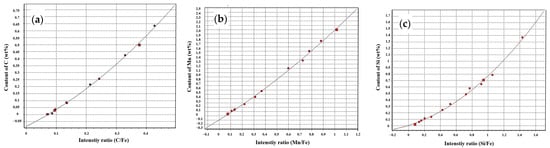 Figure 1. Calibration curve of content for different elements. (a) C, (b) Mn, and (c) Si.