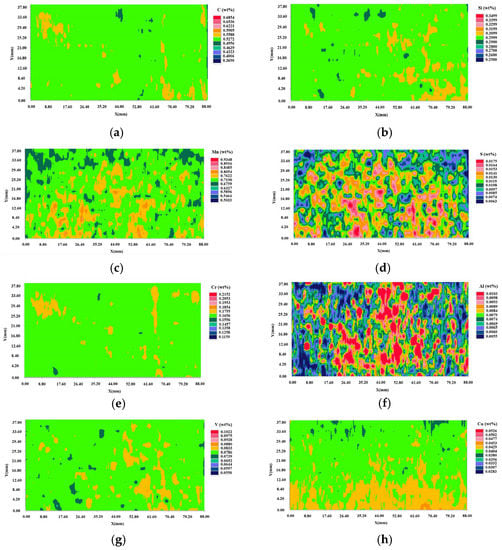 Figure 3. Quantitative distribution results of elements, (ah) 2D content distribution of C, Si, Mn, S, Cr, Al, V, and Cu.