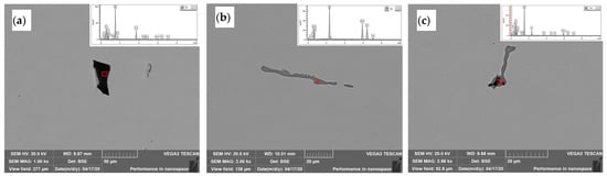 The inclusions along the rolling direction of the wheel have been analyzed. The inclusion sampling and testing area at the wheel rim is shown in Figure 2b. The sample with the size of 15 × 25 × 10 mm3 was cut from the wheel rim. After the process of grinding, fine grinding, polishing and absolute ethanol cleaning of the surface, the sample was analyzed by SEM (Vega3, Tescan Co. Czech, Brno, Czech Republic) combined with the particle identification and analysis module of energy dispersive spectrometer (EDS) (Aztec, Oxford, UK). The analysis area was 12 × 20 mm2. Aluminum foil was pasted to the edge of the sample to calibrate the gray scale of the electron microscope image. By adjusting the appropriate brightness and contrast and setting the suitable brightness threshold value for inclusion recognition, inclusion particles have been identified. Then the composition of inclusions was determined by EDS analysis automatically.