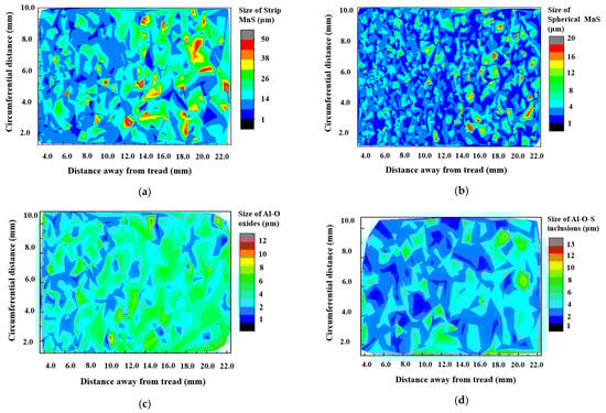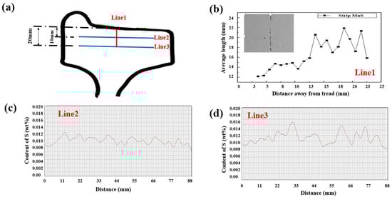 Figure 10. Correlation between strip sulfide distribution and content distribution of S. (a) Analytical area; (b) variation of average length of sulfides from the depth of 4 mm to 23 mm below the tread surface; (c) content distribution of S in the depth of 10 mm below the tread surface; (d) content distribution of S in the depth of 20 mm below the tread surface.