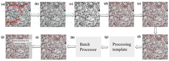 Figure 7. Batch processing flow of wheel microstructure image. (a) Original image from SEM; (b) image denoising; (c) contrast adjustment of the feature image; (d) image segmentation through gray threshold; (e) feature recognition of microstructure; (f) small holes removed from the recognized features; (g) processing template of single image generated; (h) image batch processing by the generated template; (i) manual correction for some images incorrectly identified; (j) ferrite area fraction obtained on different region of wheel rim.