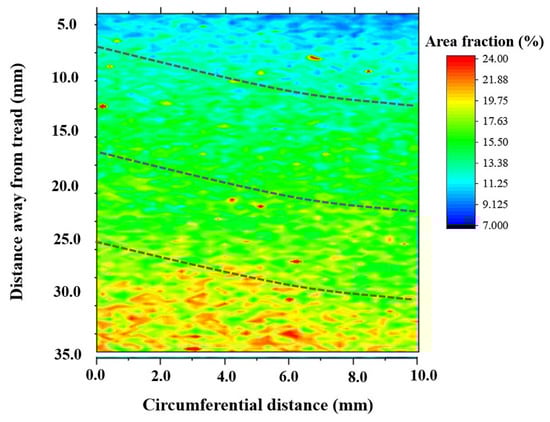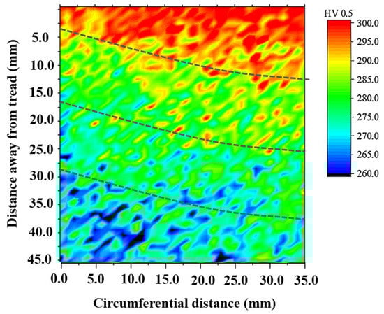 The microstructure in the wheel rim was composed of a lamellar pearlite with a small amount pre-eutectoid ferrite (dark region in secondary electron (SE) image of Figure 7) mainly distributed along the prior austenite grain boundary. The quantitative processing method of microstructure images acquired from high throughput SEM was studied. According to the gray difference of the two-phase structure in the wheel, the effective extraction and segmentation of ferrite structure were obtained after noise reduction, contrast adjustment, threshold segmentation, feature stripping and debris removal as shown in Figure 7. The image processing template was generated and was used to process all microstructure images acquired in bulk to realize the segmentation and recognition of ferrite structure. After further confirmation and correction manually, the area fraction of ferrite on different positions of rim was obtained. The two-dimensional distribution of ferrite area fraction in the central area of rim is shown in Figure 8. It was found that area fraction of ferrite was gradually increasing from trend surface to the inside area. In the radial depth of 5 mm below the tread surface, the ferrite area fraction was about 10%, but in the radial depth of 35 mm away from the tread, the ferrite area fraction increased to more than 20%. The distribution of circumferential ferrite was asymmetrical and the ferrite area fraction near the flange was significantly higher than that on the other side. The two-dimensional distribution of micro hardness below the tread surface in the rim center area is shown in Figure 9. The hardness distribution trend was just opposite to the ferrite area fraction distribution. The Vickers hardness value varied in range from 260 HV to 290 HV, with the trend of increasing hardness toward the tread surface and toward the right-hand (field) side of the wheel rim.