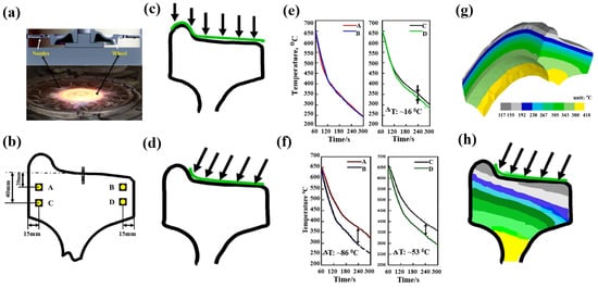 Figure 11. Temperature distribution in different regions of wheel rim under water spray quenching process of tread. (a) Wheel quenching process; (b) location of temperature measuring points; (c) spraying water process at a vertical angle to tread; (d) spraying water process at an oblique angle to tread; (e) cooling curve at a vertical angle; (f) cooling curve at an oblique angle; (g) calculated temperature field distribution at a vertical angle; (h) determined temperature distribution at an oblique angle.