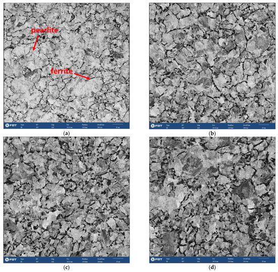 Figure 12. Microstructure morphology at different positions from tread, (a) 5 mm, (b) 15 mm, (c) 25 mm, and (d) 35 mm.