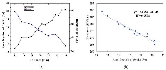 Figure 13. Mapping correlation between ferrite area fraction and micro Vickers hardness. (a) Distribution in different depth away from tread for area fraction of ferrite and vickers hardness; (b) Hardness variation with the change of area fraction of ferrite.
