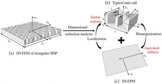 Figure 1 shows the analytic process of the triangular HSP by using a VAM-based equivalent model. From a macroscopic standpoint, the whole plate was equivalent to a continuous medium, with the displacement expected to vary slowly over one unit cell. From a microscopic standpoint, the displacement showed a considerable but small amplitude change over one unit cell. Hence, the displacements of the original triangular HSP may be represented by the displacements defined along the reference plane ( disappears), with the partial derivative [31]