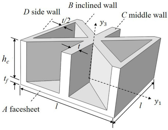 where the subscripts A, B, C, and D represent the facesheet, inclined wall, middle wall, and side wall, respectively, as illustrated in Figure 2, and t are the thickness of the facesheet and core wall, respectively, is the height of the core layer, and l is the cell side length.