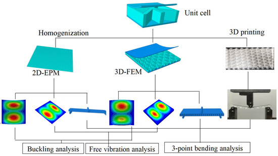 In this section, numerical simulations and experiments are used to validate the accuracy of 2D-EPM. The comparison analysis process is shown in Figure 3. Compared with the bending test, the buckling and dynamic tests are more complex. This article mainly studies the stiffness, buckling eigenvalue and natural frequency of triangle HSPs, which are also mainly related to the equivalent stiffness. Therefore, the accuracy of different static and dynamic numerical simulation depends on the accuracy of calculated equivalent stiffness, which is verified by the bending test to a great extent.