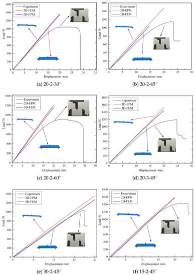 The slopes corresponding to the displacement–load curves obtained from the three-point bending experiment and numerical simulation can be used to reflect the bending performances of the panels. Based on the principle of control variables, the triangular HSP with different core wall thicknesses t, including angles , and cell side lengths l were selected to ensure the universality of the model verification. Figure 4 compares the displacement–load curves obtained from three-point bending tests, 3D-FEM and 2D-EPM simulations, and the images of the deformed test specimens are shown in the subfigure.