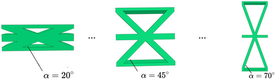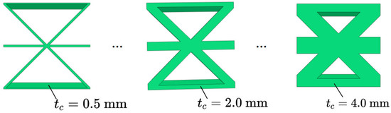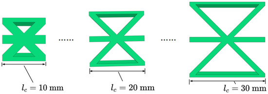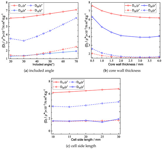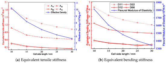 Figure 11 and Figure 12 show the the geometric configurations of core cells with different cell side lengths and their effects on the equivalent stiffness. Figure 12a shows that the equivalent tensile stiffness decreased gradually as the cell side length increased. The main reason was that increasing the cell side length reduced the equivalent density and in-plane equivalent elastic modulus. Figure 12b shows that the equivalent bending stiffness decreased gradually with increasing cell side length, which was consistent with the change of the equivalent tensile stiffness.