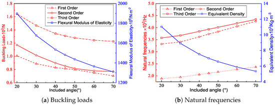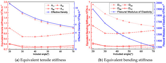 Figure 14a shows the specific stiffness (equivalent stiffness-to-density ratio) of the triangular HSP corresponding to different included angles. The specific stiffnesses mainly increased with the increasing included angle, indicating that a panel with a larger included angle could improve the bending performance. Therefore, it is necessary to choose the in-plane core layout with a larger included angle to make full use of the bending performance in practical use.