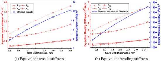 Figure 9b shows that the variation trend of the equivalent bending stiffness was similar to that of equivalent tensile stiffness, and both increased with increasing core wall thickness. The reason may be that the bending capacity of the plate mainly determined by the part away from the neutral axis of the plate. The sectional moment of inertia of the plate increased with increasing core wall thickness, so that the moment of the bending equivalent elastic modulus also increased with increasing core wall thickness.