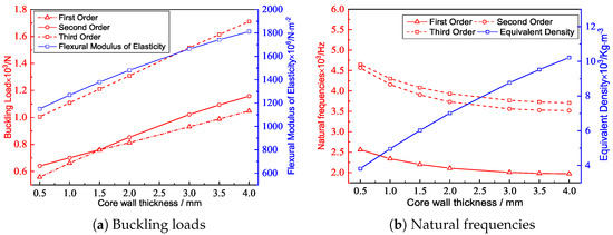 Figure 14b shows the specific stiffness of the triangular HSP corresponding to different core wall thicknesses. The specific stiffness decreased as the core wall thickness increased, and the reduction rate decreased as well. In practice, if there were no additional special requirements or restrictions on the core wall thickness, the triangular HSP with thinner core wall thickness should be used since it can improve the bending performance of the panel.