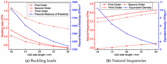 Figure 13 shows the effect of the cell side length on the buckling load and natural frequency of the triangular HSP. From a macroscopic standpoint, the equivalent elastic modulus of the 2D-EPM decreased with increasing cell side length, so the buckling load also decreased. From a microscopic standpoint, increasing the cell side length would increase the calculated length of the panel and further reduce the buckling load. The effect of the decreasing equivalent density caused by the increase in the cell side length on the natural frequency was greater than that of the decreasing equivalent stiffness, so the natural frequency of the triangular HSP increased. A high anti-buckling capacity of the triangular HSP can be realized by decreasing the cell side length.
