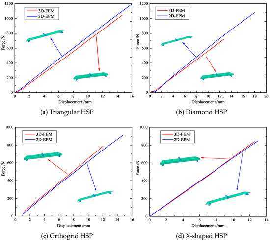 Three-point bending numerical simulations of four HSPs with different core forms were carried out by using different models. On this basis, the bending capacities of the four sandwich panels were compared according to the slopes of displacement–load curves. Figure 15 shows the simulation results of the 2D-EPM and 3D-FEM. The errors between the simulation results of the different models were small, and the two curves were approximately coincident, indicating that the numerical simulation results were relatively reliable and that these simulations can be used for detailed analysis. Furthermore, the triangular HSP exhibited the strongest bending performance (slope = 72 N/mm), followed by X-shaped HSP (slope = 65 N/mm), diamond HSP (slope = 64 N/mm), and finally, the orthogrid HSP (slope = 58 N/mm), which was mainly related to the sectional bending modulus of the – plane.