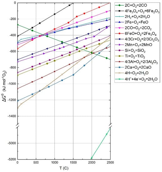 The actual reduction potential of hydrogen in the plasma state can be explained using the Richardson–Ellingham diagram. Figure 1 shows the Ellingham diagram calculated by FactSage 8.0 (GGT, Herzogenrath, Germany) with additional hydrogen lines in an atomized and ionized form. The chart shows the Gibbs free energy of the metals’ reaction with one mole of oxygen via the temperature. All metal and oxides activities are set to 1, and all reactions are standardized with one mole of molecular oxygen. In this particular case, the y-axis could also be interpreted as the oxygen potential due to the relationship in Equation (6). The lower the ΔG value of a chemical reaction, the more stable the product is, which means that the lower the reaction line is set in the diagram, the higher the reduction potential of the metal, or in the case of carbon monoxide and hydrogen, of the gas. To obtain information about the ΔG value of the final reaction, a combination of two or more reactions listed in the diagram can be performed using Hess’s law. An example of such a combination can be seen in Equation (11), which combines Equations (7)–(10) to reduce iron oxides to metallic iron with molecular hydrogen.