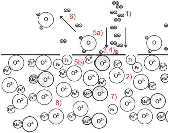- Desorption of water vapor (5a) and metallic iron (5b) from the phase boundary.