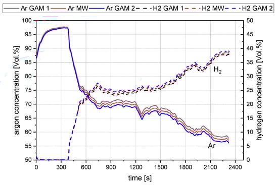 As mentioned in Section 3.1, two mass spectrometers were used to conduct the trials. All final results concerning the gas composition of this study are the mean values of the two measurements. Figure 6 shows the deviation between the two measurements (GAM1 and GAM2) for argon and hydrogen and the mean value of both lines (MW).