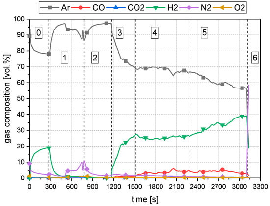 The resulting gas analysis for the experimental program is shown in Figure 7. Phase 0 is not part of the testing procedure. In phase 0, the system’s tightness was checked to avoid any gas leakage during the trial. The drop of argon between phases 1 and 2 and the introduction of nitrogen in these phases occurs due to the gas supply stopping before starting the arcing process. This gas flow stop is necessary because during the ignition step, the distance between the HGE and the crucible is lowered to a point where ore would be blown away from the crucible on the full gas flow. Phases 3 to 5 show the trends for the reduction process with hydrogen. In phase 6, the applied nitrogen purging can be seen due to the sudden increase in the nitrogen content.