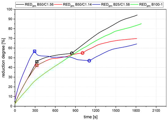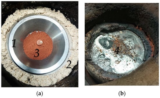The left photo in Figure 8 shows a view of the crucible (1) with the protective refractory ring (2) and with the charged ore batch (3) before the trial B50/C1.4. After the experiment, the right photo presents the crucible with the solidified molten material (4). It is evident that the melt has formed a more or less flat surface. The reason is that the crucible’s sidewalls were melted down. The total volume of the molten material is composed of the molten and reduced iron ore, the ignition pin, and the melted sidewalls of the crucible. A small amount of non-melted or reduced ore remains in the center on the surface. This discharged material originated from the HGE during the dismantling of the reactor. This amount is subtracted from the initially inserted ore mass (Table 3). Without this subtraction, the calculation of the reduction degree would result in excessively high values.