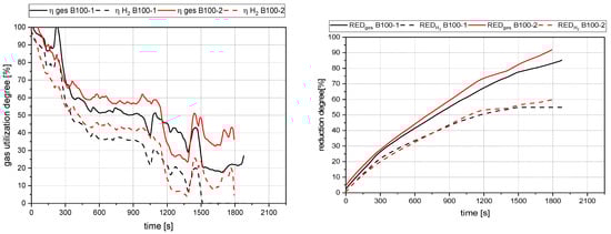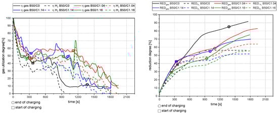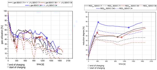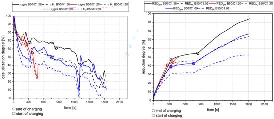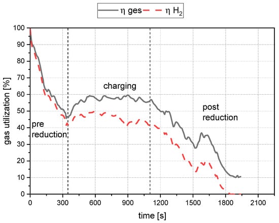 The species CO, CO2, and H2O, are used for X. In the case of CO2, the multiplication by two must be performed because carbon dioxide binds two oxygen atoms to itself. The carbon for this process originates mainly from the oxidation of the cathode. The gas utilization rate is calculated from the oxygen removing species’ quotient and the injected hydrogen volume. Figure 9 shows the evaluation of the gas utilization for trial B50/C1.04. The dashed lines mark the start and the end of the charging process.