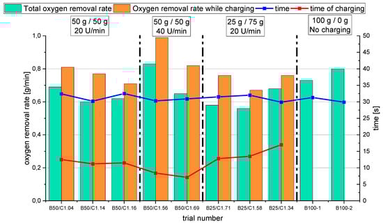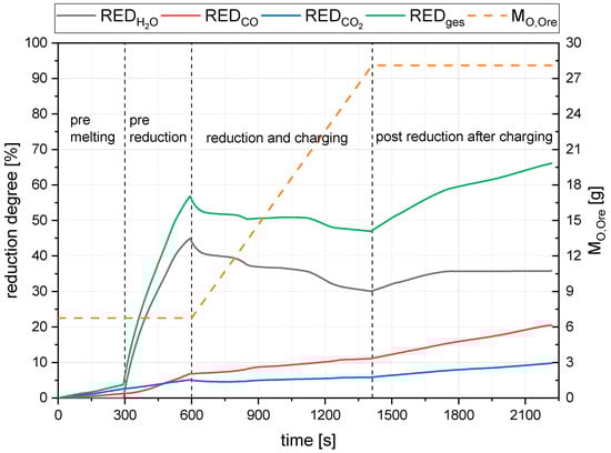 All experiments were performed with the same experimental program according to the gas composition and the melting time. The program consists of premelting, pre-reduction, reduction, and charging, and a final reduction after the charging. The design of the experiments is shown in Table 2. In the current study, twelve experiments were conducted to investigate the method’s applicability to evaluating optimal charging rates for the HPSR process. The tests differ by the type of iron ore charging (batch charging in the crucible and continuous charging), the system’s charging rate, and thus the absolute masses of charged oxygen per time during the premelting and feeding process. The value for the oxygen charged represents the iron bonded oxygen in the ore. Table 2 also shows the experiment names with the respective quantities of iron ore charged as a batch in the crucible and continuous with the feeding system. The iron ore charging rate is directly adjusted via the powder-dosing instrument. The oxygen-charged ratio is calculated via the mass flow of iron ore and the chemical composition in Table 3. The bonded oxygen in the charged material was calculated as an absolute value in grams. The LOI (loss of ignition) was also included in the calculations to consider the lost mass due to heating in the reactor.