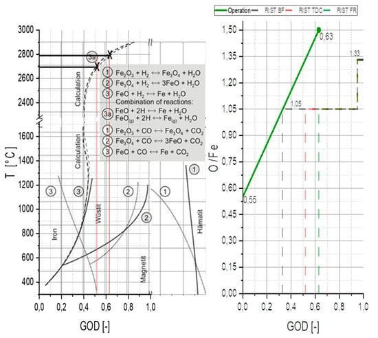 These formulas are summarized in Equations (20)–(22) for the individual reactions of hematite, magnetite, and wüstite towards iron to describe the chemical reactions during the reduction of iron oxides using hydrogen plasma [24].