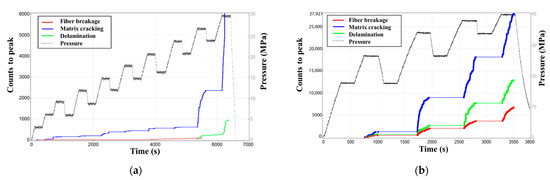 Based on the damage criterion algorithm presented in Section 3.3, the AE signal of the vessel is loaded into the 0–30 and 0–40 MPa hydraulic pressure tests for modal separation, and the separation result is shown in Figure 11. The algorithm can effectively realize the accurate identification of three damage types (fiber fracture, matrix cracking, and interface delamination). The matrix cracking signal increases considerably at the pressure of >20 MPa, and the interface delamination damage and fiber fracture damage signals increase slightly. The total amount of the matrix cracking signal during the loading process exceeds other signals, but the fiber breaking signal mainly appears under high load. The amount of fiber breaking signal before the final vessel failure is considerably smaller than other damage modes. Figure 11b shows that the fiber fracture signal increases in the high load part above 30 MPa. Compared with the parametric analysis, the aforementioned analysis results can realize the effective separation of different damage types and are able to characterize the law of damage evolution.