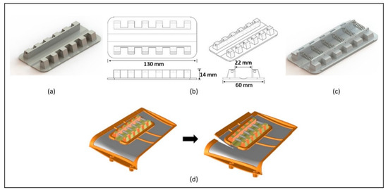 A prototype of the actuator developed to control aircraft system wings constituted by support (nylon) with the incorporation of SMA actuator springs is shown in Figure 2a. The dimensions of the prototype are 130 mm in length and 60 mm in width (Figure 2b). Six SMAs springs (diameter of wire 0.63 mm) were inserted in support specially developed to accomplish the objective to accommodate each one (Figure 2c). Two tiny grooves are cut along the length of the prototype to adjust an SMA wire (on each side) used as an electrical conductor; each SMA spring has contact with the SMA wire (Figure 2c). In the electrical circuit, the current goes through the system of springs to actuate in two, four, six, or eight SMA springs simultaneously. The distance between springs is 10 mm. This system placed in the wings provides control of the structure through different angles. Figure 2d shows the aircraft wing with the actuator.