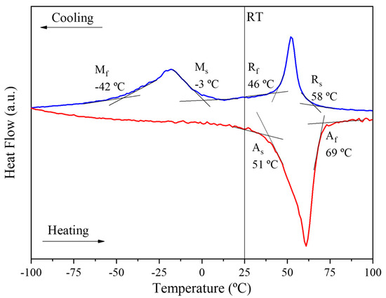 The spring has a martensitic phase at room temperature (25 °C), as shown by the Differential Scanning Calorimetry (DSC) curve (Figure 3). Tests were carried out at temperatures ranging from −100 °C to 100 °C under a controlled heating/cooling rate of 10 °C/min. Before analysis by DSC, the specimens were cut and chemically etched (10%HF + 45%HNO3 + 45% H2O (vol.%)) to remove oxides, as well as the layer deformed by the cutting operation (final mass: ~17 mg). The phase transformation temperatures are: As = 51 °C and Af = 69 °C; Rs = 58 °C; Rf = 46 °C, Ms = −3 °C; Mf = −42 °C. A superelastic NiTi wire (Fort Wayne Metals) with a diameter of 0.5 mm was selected to be used as an electric conductor making contact between the springs, with Af = 27.9 °C [19,20,21,22].