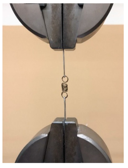 A Shimadzu Autograph AG-X Universal Tester Machine equipped with a 5 kN load cell was used to test the tensile behavior of the NiTi springs and wires. The SMA spring was connected to the machine using a hook (Figure 4). Then, tensile tests under displacement control at room temperature (25 °C) were performed. After reaching the predefined length (22.0 mm) in the design of the prototype, the displacement was stopped and complete heating/cooling cycles were carried out on the spring. Firstly, the springs were heated (>Af temperature) and then cooled to room temperature (RT) for ten (S10), twenty (S20), and thirty (S30) seconds, in order to simulate the real action of the spring and measure the resistance force imposed by the spring in the test (15 cycles by spring test).