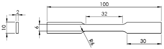 The specimens submitted to the tensile tests had the geometry shown in Figure 5 with dimensions of 100 × 10 × 2 mm3. The tensile tests were performed according to ASTM D 3039, using a Shimadzu Autograph AG-X Universal Tester Machine equipped with a 5 kN load cell, and the TRAPEZIUM X software for data processing, at a load rate of 5 mm/min and a gauge length of 62 mm.