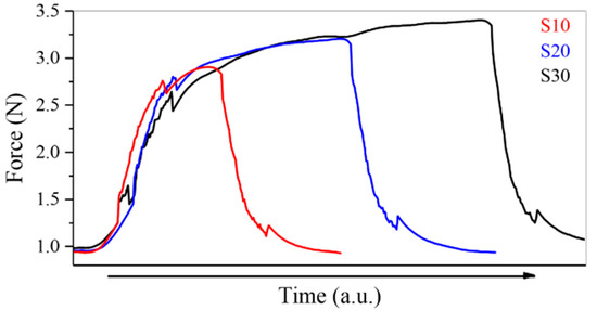Force vs. time of the thermal cycle of the NiTi spring (tensile test) (10 s (S10), 20 s (S20), and 30 s (S30)).
