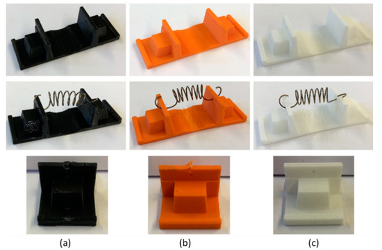 Visual aspect after thermal resistance tests on the supports (one spring): (a) PLA; (b) ABS; (c) PA12.
