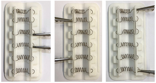 After the selection of the prototype materials, the supports for the prototypes in PA12 were manufactured by Selective Laser Sintering (SLS), and the NiTi springs were assembled to the supports (Figure 9).