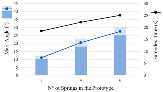 The characterization test values for the prototype are summarized in Table 3. The highest angle of inclination of the prototype (Figure 10) was attained for the highest number of springs tested (6). It is possible to vary the angle reached and the extended spring according to the number of springs in the prototype. The retracted time with cooling induction was considerably shorter than without cooling. Figure 11 highlights the linear relationships between the angle of inclination value of the prototype and opening time versus the number of SMA springs.