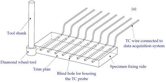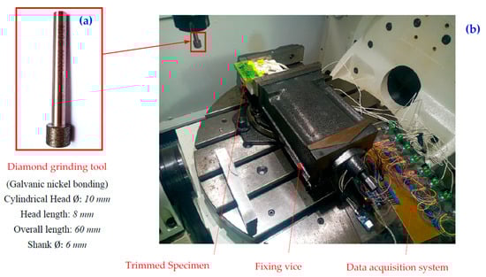 Edge trimming experiments were executed on a Spinner U-620 5-axes High Speed CNC Machine giving a maximum spindle speed of 12,000 rpm and a maximum power of 19 KW. The experimental set-up, including the mounting of the tool, the test piece, and the temperature acquisition device, are shown in Figure 2. The edge trimming operations were performed using a unique diamond grinding-metal bonding tool of 10 mm in diameter, 50 mm in length, and 10 mm of effective cutting length. During processing, the depth of cut and the cutting speed were kept constant at 0.2 mm and 283 m∙mn−1, respectively. In these experiments, dry machining was employed since the cutting fluid is not allowed in some industrial fields [] and is considered disadvantageous to maintaining the chemico-physical characteristics of the epoxy matrix [].