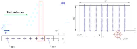 A temperature acquisition system was specially designed to measure the in-process temperature along the machined surface. A set of eight thermocouples were incorporated into eight pre-drilled blind holes, whose diameter (2 mm) was very slightly larger than that of sensor probes, and evenly distributed along the machining path as illustrated in Figure 1a and Figure 2b. With the intention of minimizing the heat dissipation effect, the sensors were introduced inside the specimen until there was a close distance of 1 mm between the probe tips and the machine surface. The thermocouples (TCs) were of type K (provided by ELECTRONIC SHOP Co., Sfax, Tunisia) and related to an Arduino Mega board, which was connected to the computer via a USB link. The data acquisition process was performed via the PLX-DAQ software interfaced with an Arduino application for processing the signal acquisition and the data transfer. The temperature-sampling rate was set at 4 measures per second. In Table 4, we summarize the technical specifications of each component constituting the temperature acquisition system. Edge milling temperatures were also controlled with an EASIR TM-4 model infrared camera placed at a distance of 70 cm in front of the machined surface. This technique made it possible to control both the increase in the temperature of the tool over the advancement and the decrease in the temperatures of the recently machined parts of the considered surface.