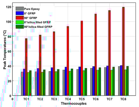 Among the measurement parameters cited above, the maximum thermocouple output values (peaks) are certainly a good comparison criterion of the specimens’ thermomechanical behaviors. To better perceive and compare the effects of each monitored manufacturing layout in temperature value magnitude, we illustrate in Figure 4 the peak temperature measured by the eight thermocouples (TC1 to TC8) for each planned test in histogram form.