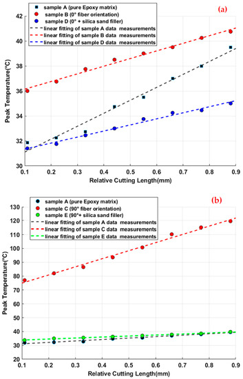 Peak Temperature over relative cutting length: (a) 0°fiber orientation samples vs. pure epoxy sample (b) 90° fiber orientation specimens vs. pure epoxy specimen.