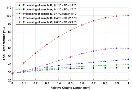Signals acquired by the TCs allow the plotting of the temperature history along the trimmed surface. Figure 3 illustrates the obtained curves during machining of the considered work specimens. As indicated in Table 4, the thermocouples provide an accuracy of ±1.5 °C with a 0.25 °C resolution, and from statistical analysis, the standard deviations (SD) were found to be too small and were inserted on Figure 3 as indications [].