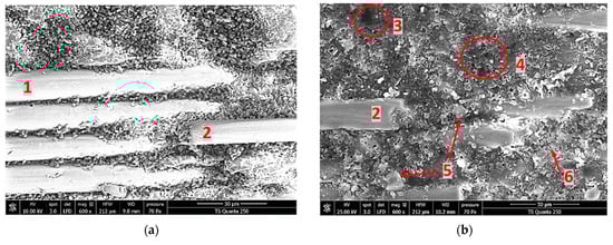 SEM Micrographs obtained when edge-trimming TCP composites parallel to fiber orientation. Legend: (1) uncovered fiber, (2) fractured fiber, (3) unfilled hiatus, (4) filled hiatus, (5) milled silica grains, (6) matrix debris. (a) Specimen B. (b) Specimen D.