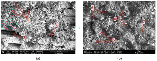 From inspections, it is clear that the fibers in sample B maintain regular diameters, unlike those of sample D, which appear to be split. Indeed, the cut land of non-loaded work part manifests the presence of fiber and epoxy debris that constitute the cut chips embedded in the matrix and inside the interstices between fibers. In the case of the loaded specimen, residual chips appear more heterogeneous and of flatter shapes. Moreover, cut land of loaded samples contains several distributed hiatuses, which represents the old locations of silica sand grains already extracted during edge trimming. Once the silica grain is being extracted from the specimen, the metal bond tool acts to trundle it along the released material by inertial and gripping effects. The separated particles act in turn to fracture the glass fiber and to grind the material matrix. Thus, the material removal rate in this case is not only subjected to the cutting characteristics of abrasive grains upon the grinding wheel tool and the CNC machine setting but also to the mass and volume of silica sand grains. Otherwise, the glass fiber orientation in the cutting area is a strong process-induced damage sign. In specimen B, the fibers remain parallel while they appear to be splintered arbitrarily in the cut area of specimen D. For the two composite configurations, the fine chips of dusty nature are spread into the wheel tool trough and the cavities and grooves left by the filler particle displacement. The accumulation of this dust as machining progresses prevents the direct thermal conduction between the tool and composite material. Therefore, the thermal generation process seems to switch from tool-material to chips-matrix interfaces. Hence, the thermal and tribology characteristics of the dusted chips (which regenerates through the tool–part contact surface) play a significant role in the thermal behavior of TCP machining. At this stage, the tool temperature measurements obtained from infrared analysis can give strong indications about the level of tool thermal energy dissipation during machining based on the nature of the chips detected by the SEM analyses [,,]. Consequently, it can be deduced that SEM and infrared analysis are complementary. Contrary to infrared captures, microscopic images cannot be obtained in real time of machining, but they allow us to distinguish defects undetectable by thermographic analysis.