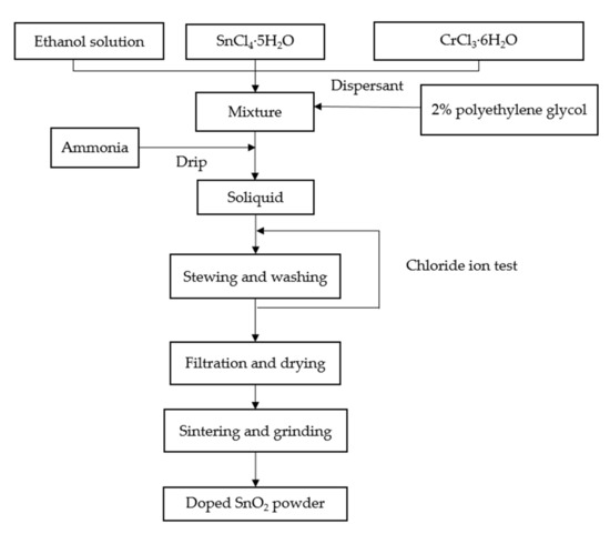 For the purpose of correspondence between simulation and experiment, Cr-doped SnO2 powders with different ratios were prepared by the sol–gel method, so that the doped ions entered SnO2 cells to form solid solutions [22]. The process of doped SnO2 powder preparation by the sol–gel method is shown in Figure 2.